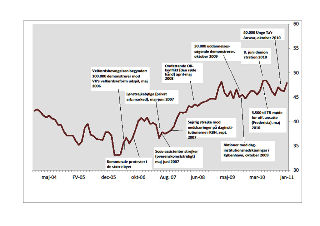 Se figur 1: AFØ, vælgertilslutning/meningsmålinger, 2004-2011, sammenholdt med strejker og velfærdsdemonstrationer i samme periode