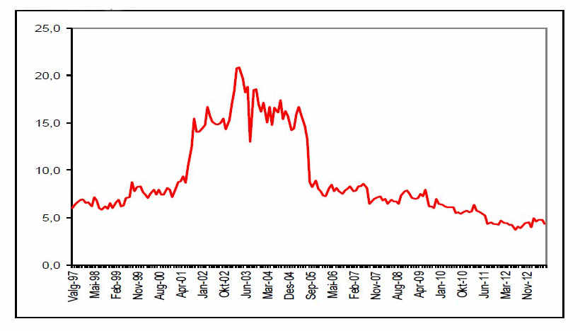 Meningsmålingsresultater for Socialistisk Venstreparti 1997 – 2012. Kilde: http://www.aardal.info/P1997.pdf